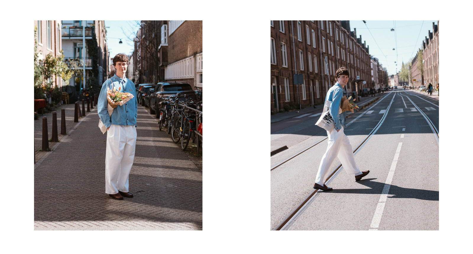 Mees kept it simple, yet classy with a pair of our new and in-house favorite pair of Consul Pants in white. On top he is wearing a Work Shirt in Delhi Denim on his feet he wears a pair of Brown Vinny's.
