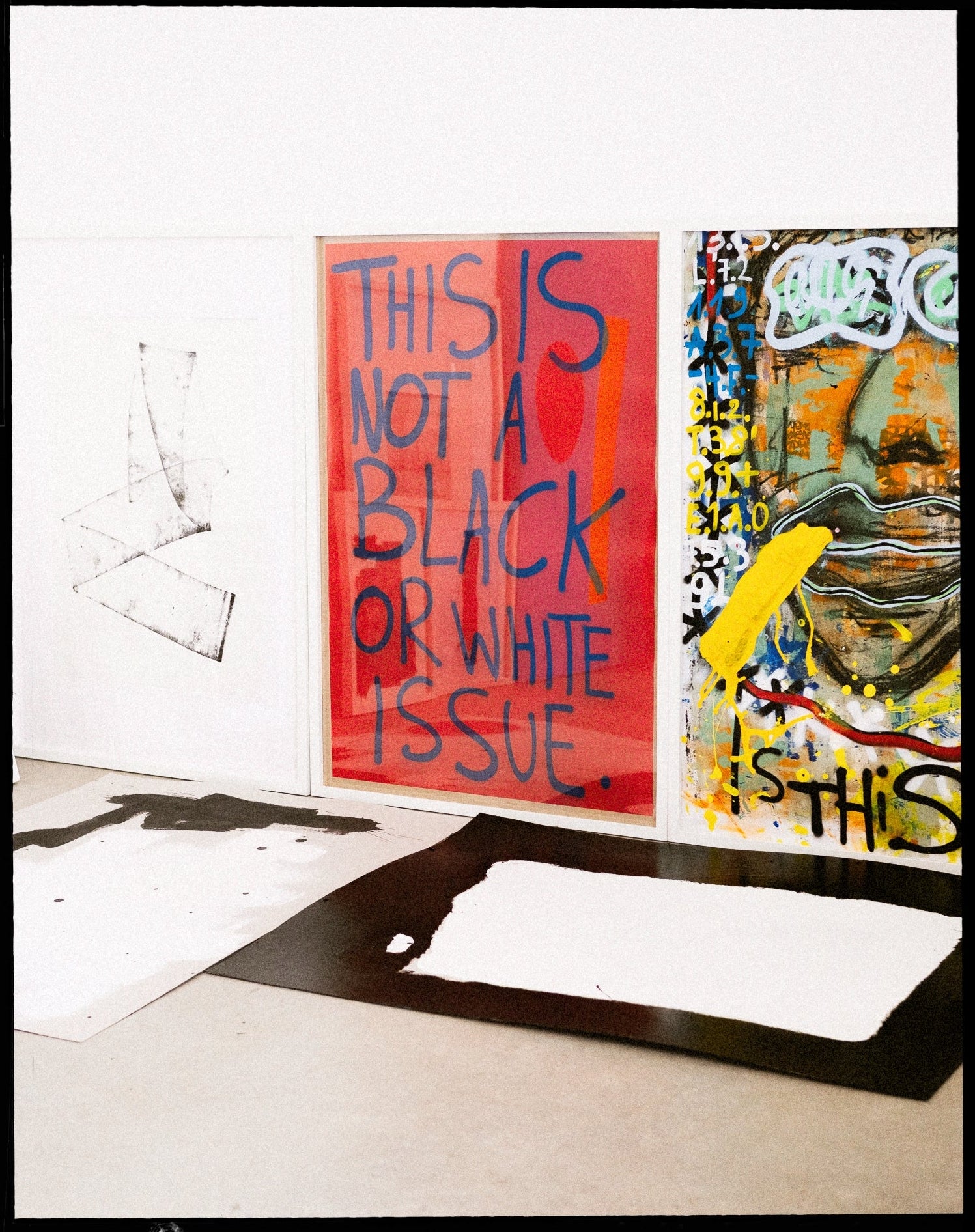 But I don’t stick to one medium. I love to do photography, sculpture, performance, painting, screen print experiments, spray paint, whatever I have at hand. Found tools are great too: once I rolled ink with a grimy street-found roller to get a dirty, tactile texture. This variety keeps me engaged.