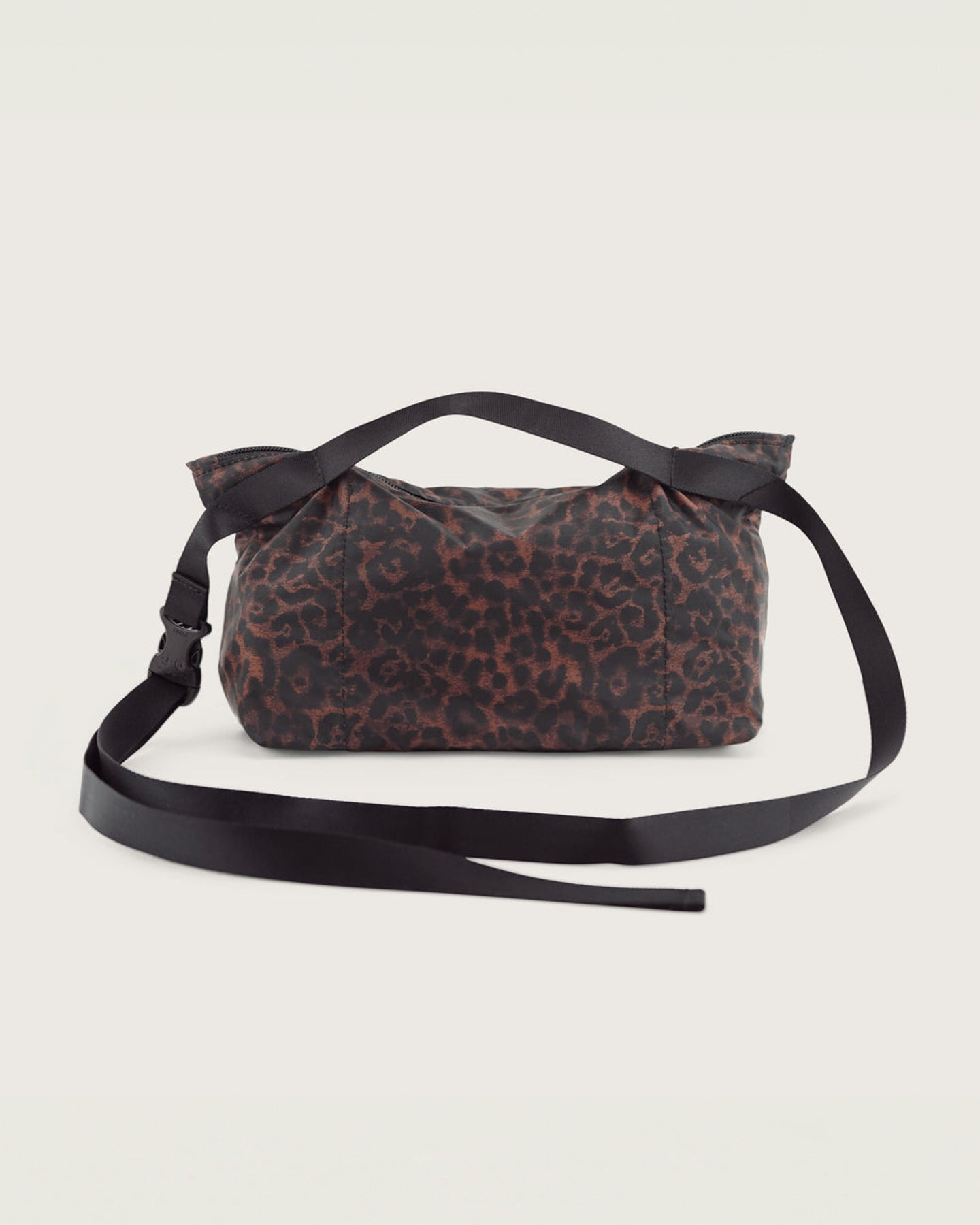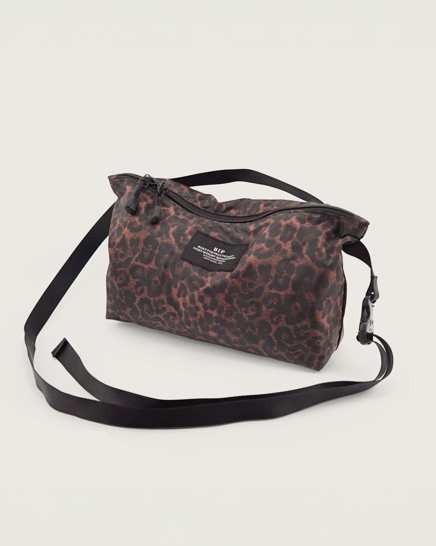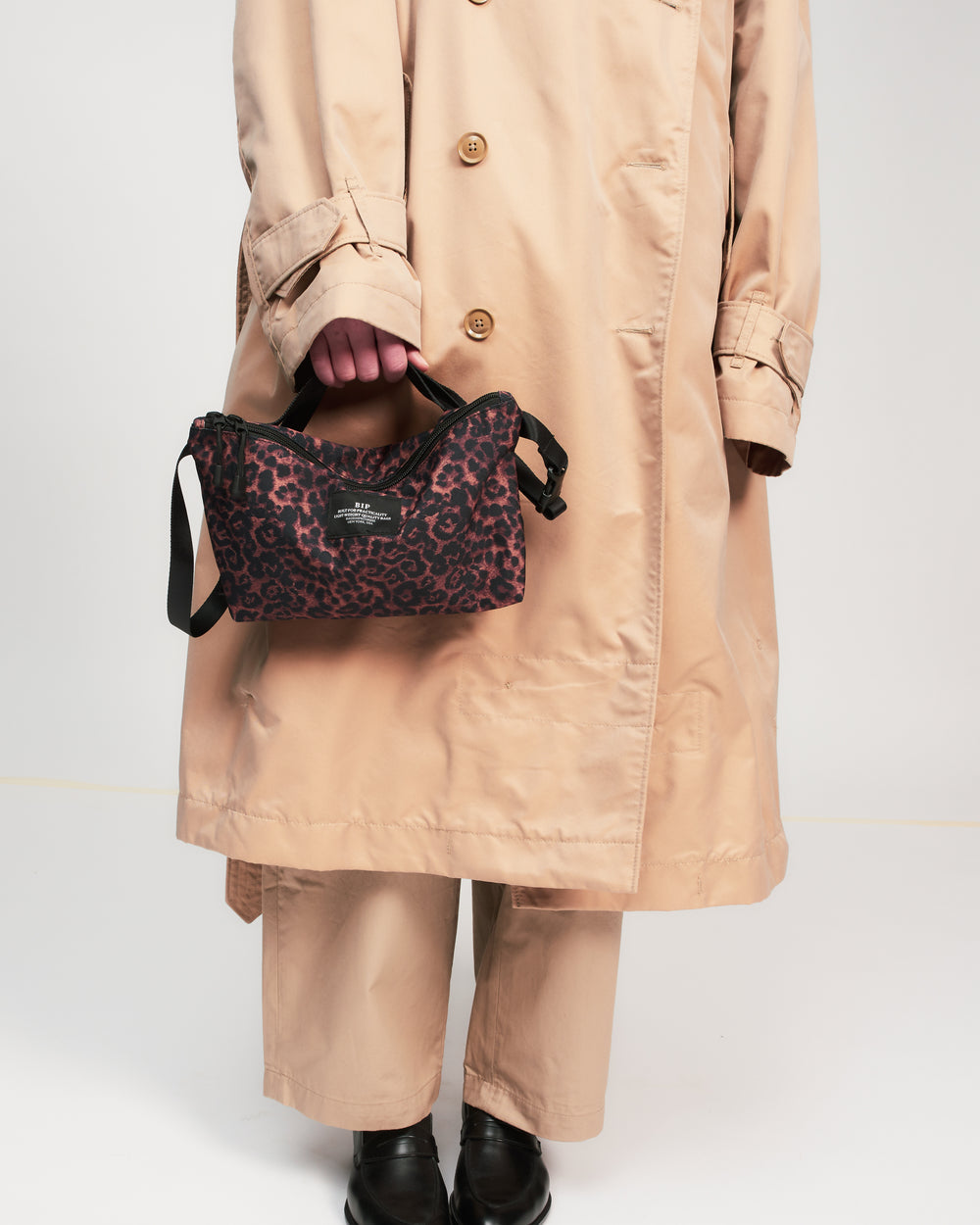 This compact 3-in-1 bag can be worn as a fanny pack, crossbody, or handbag. It features a zippered top, a long adjustable strap with a plastic buckle, and a concealed handle on the back. The interior includes a pocket for small essentials, and the material is water repellent.