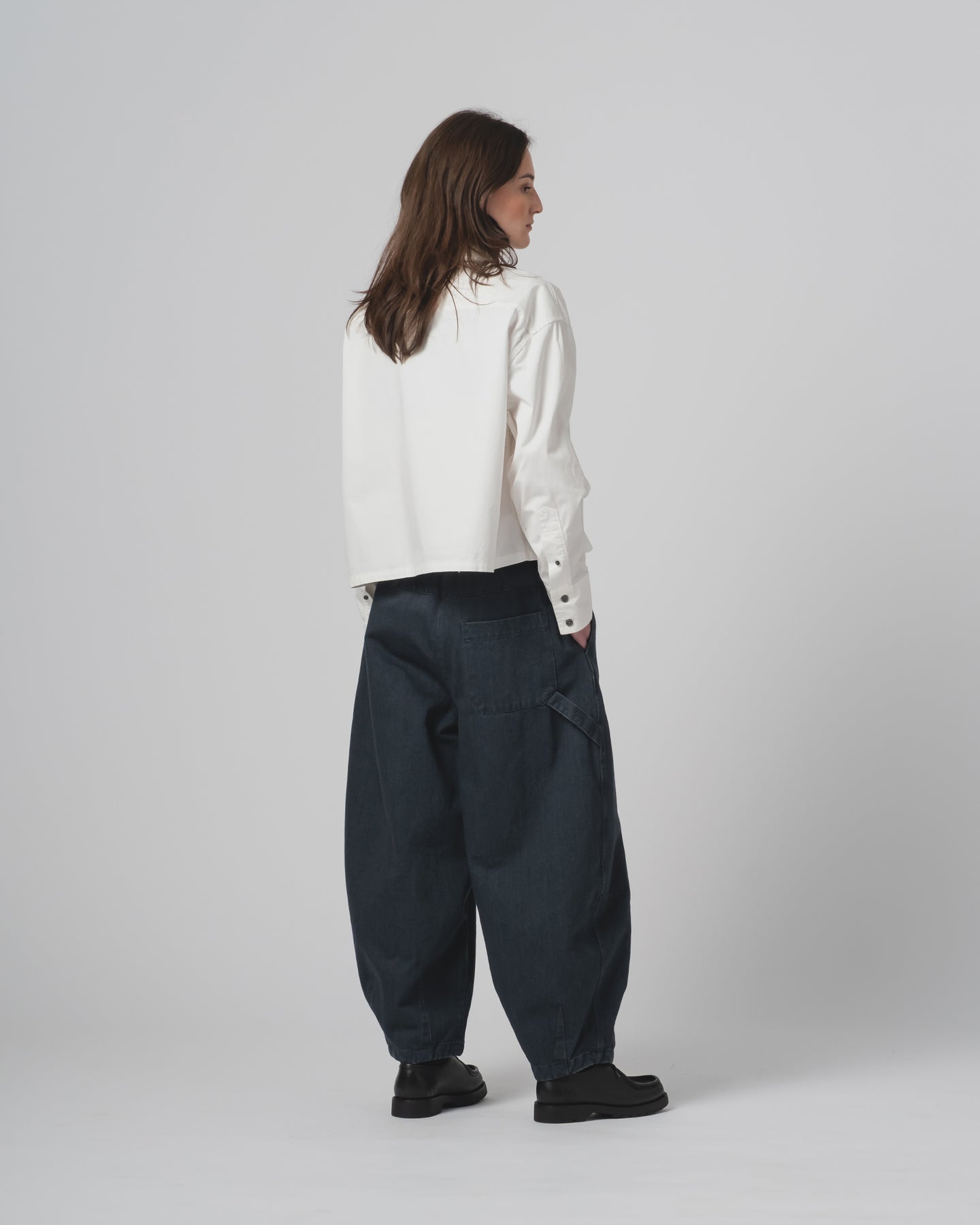 We took a true oversized Mens shirt, with a regular fit, asymmetrical pockets and cut it in half to give it a loose boxy fit and jacket like feel. Made in a white poplin version for summer and finished with Corozo buttons.