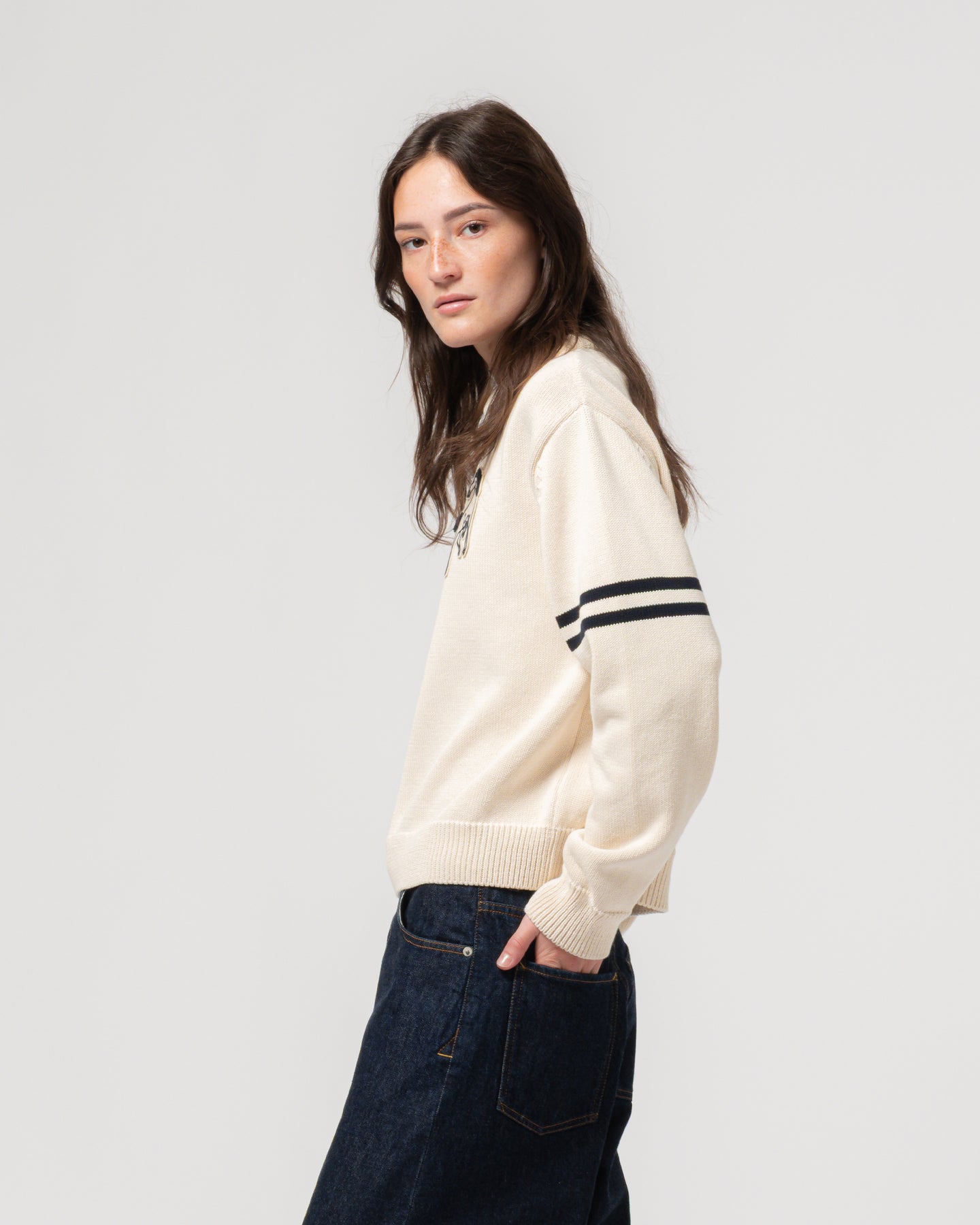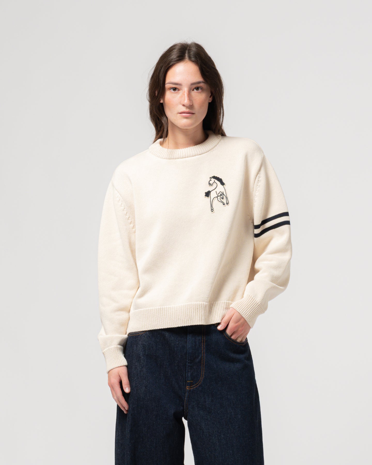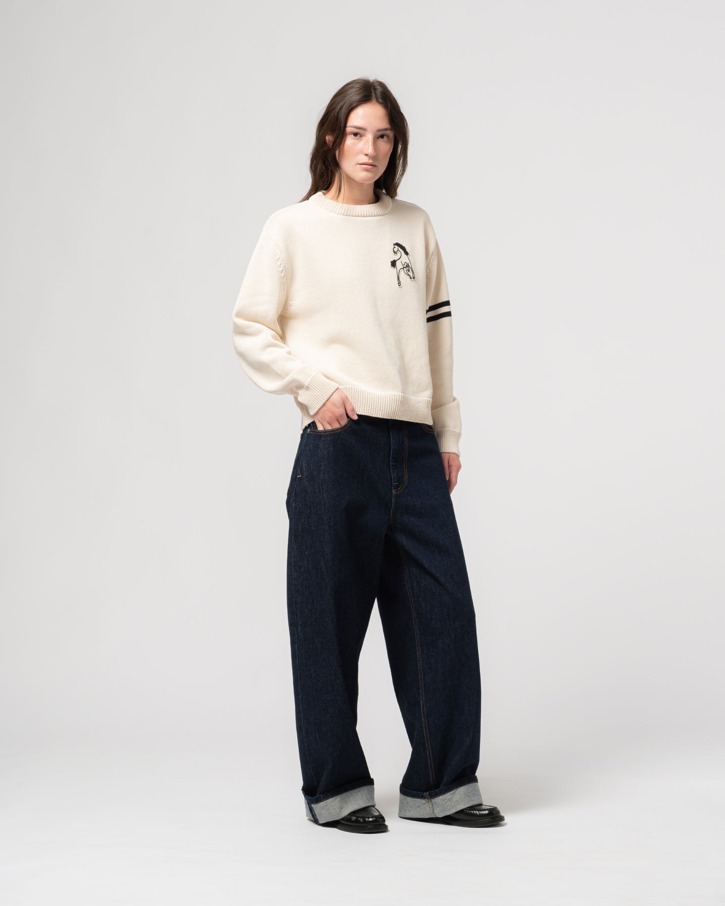 Our League sweater is a knitted cotton jumper featuring a clean, modern silhouette with a subtle horse patch detail. Designed as a new style for the Spring Summer 2026 season, it has a cropped fit for an effortless, contemporary look.