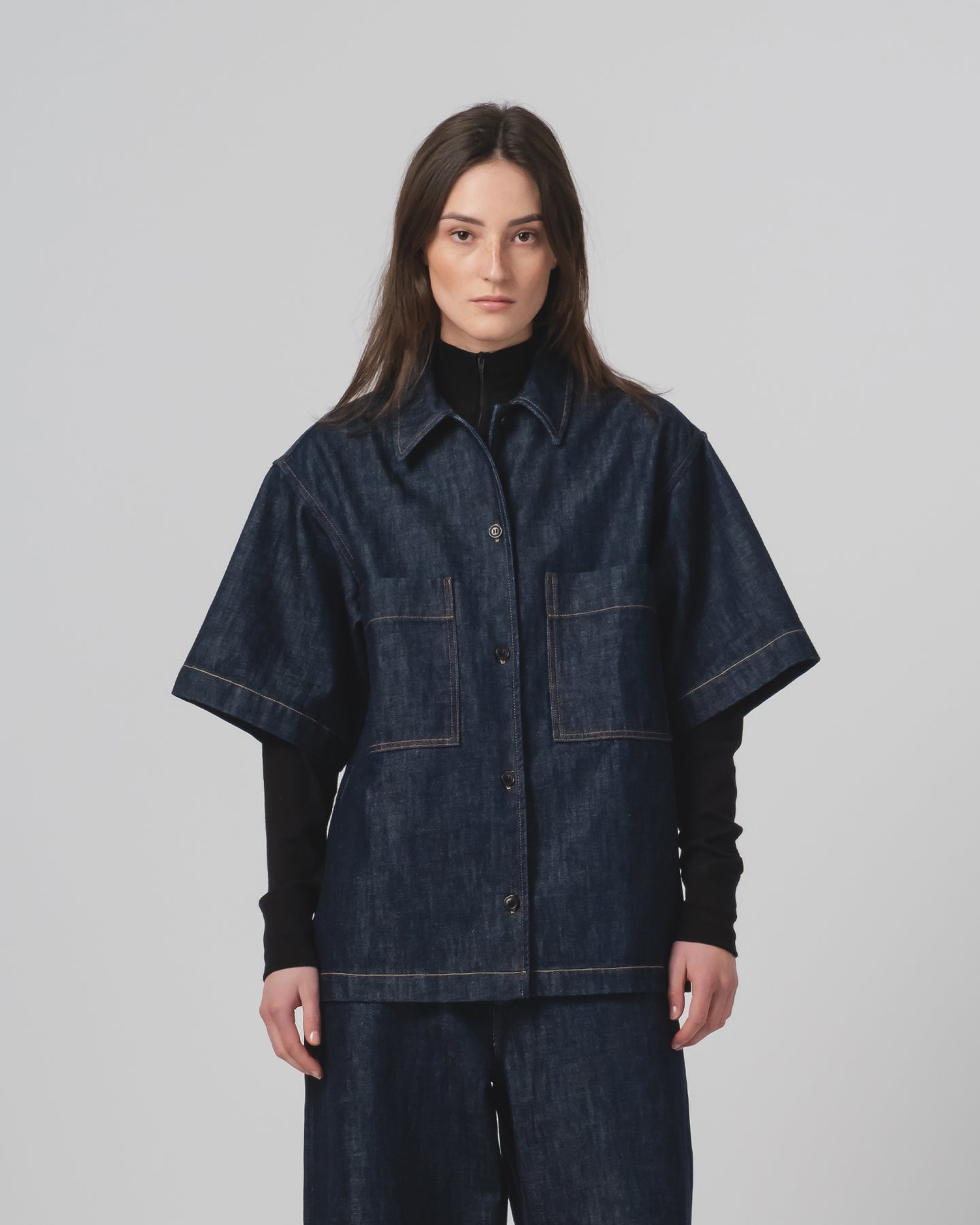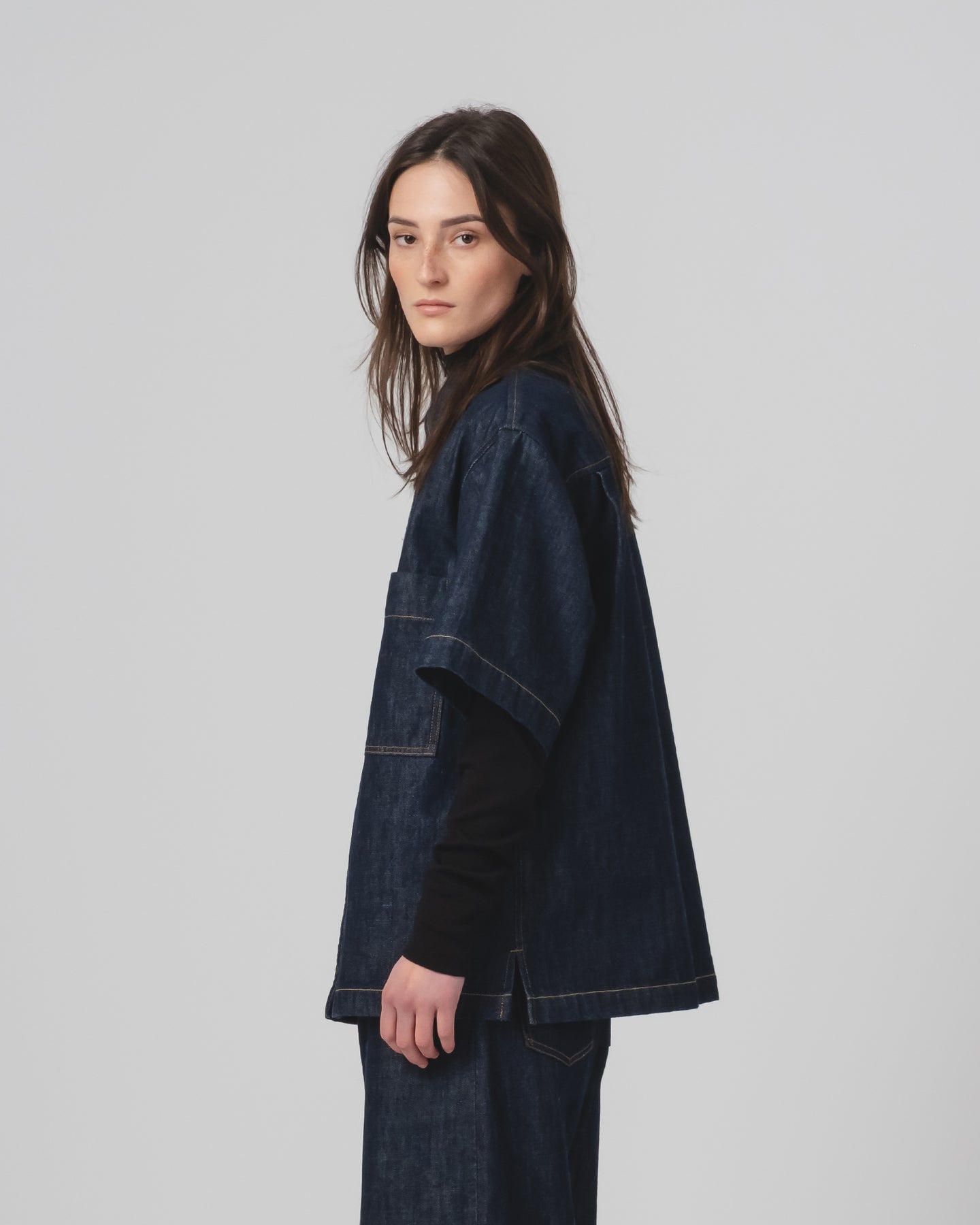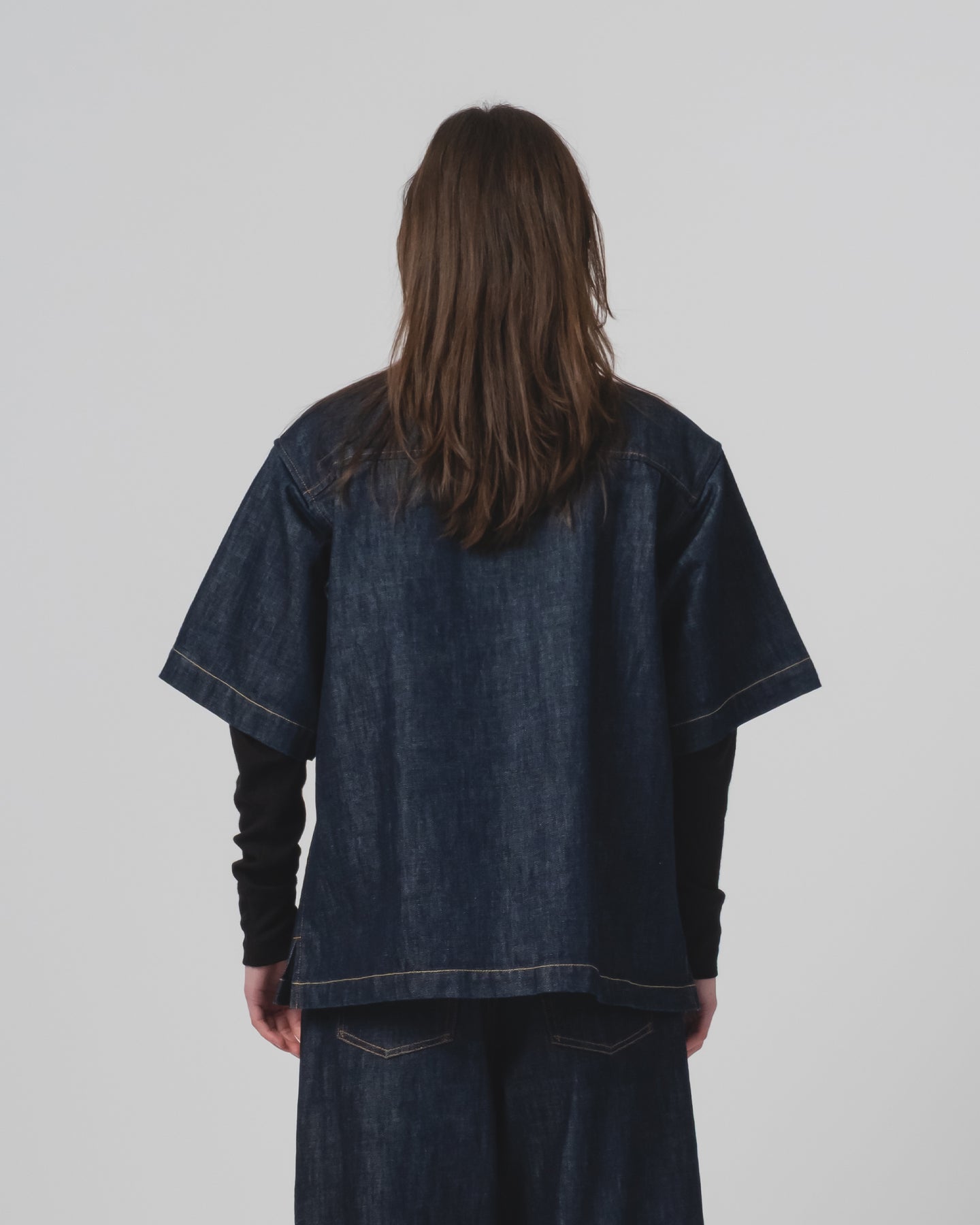 Our Okinawa Shirt is a versatile long overshirt and back in a denim variation for winter, combining a comfortable relaxed fit with everyday ease. Designed with two chest pockets for added functionality, it features short sleeves for a relaxed fit — perfect for layering over your favorite tee or wearing on its own.