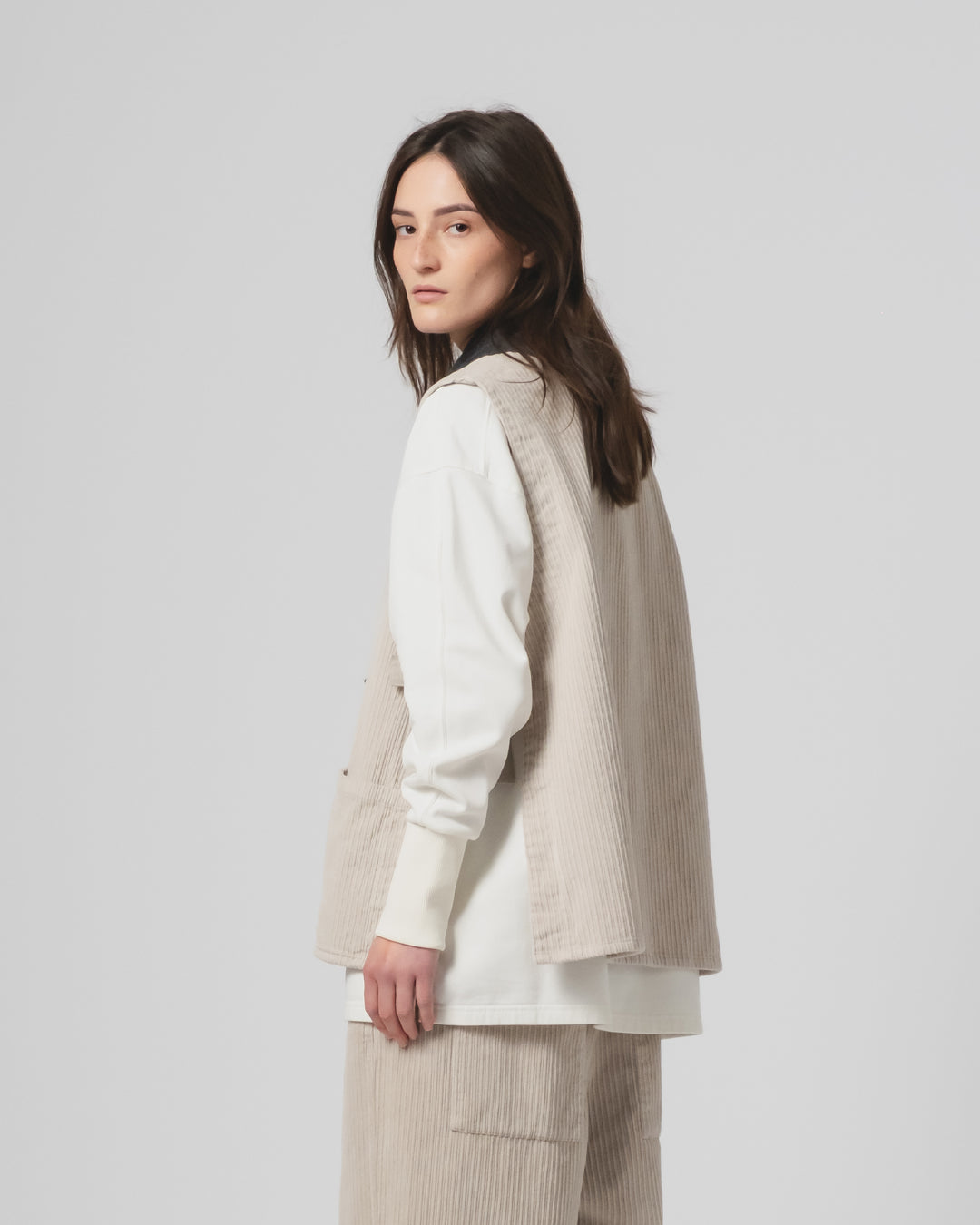 Reimagined from a long-sleeved archival piece, the Painter Smock is a modern twist on a classic workwear silhouette. This sleeveless V-neck pullover retains its original oversized shape, with a longer length and two generous front pockets for function and ease. Stripped back and simplified, it’s a versatile layering piece that brings utility and style into effortless balance.