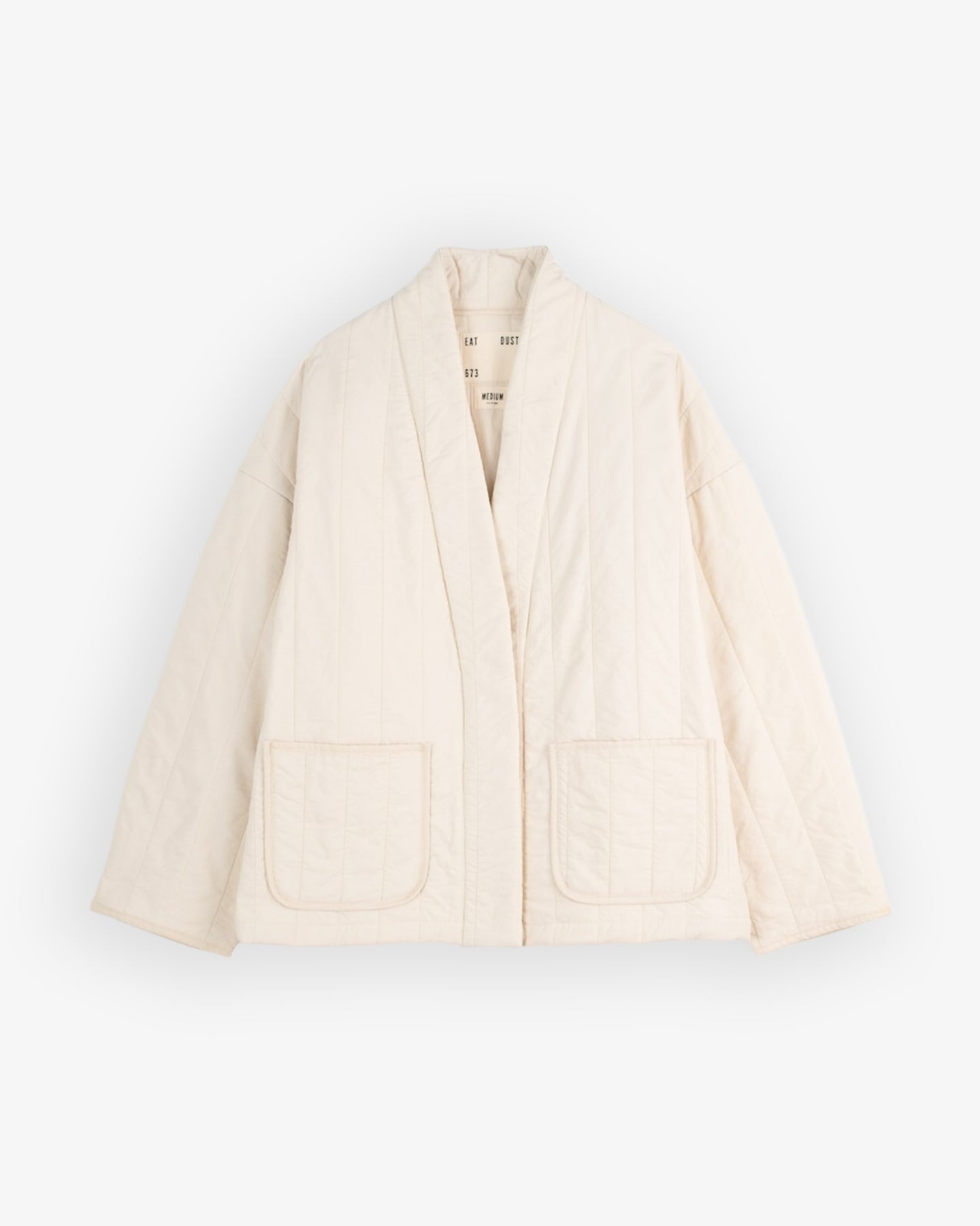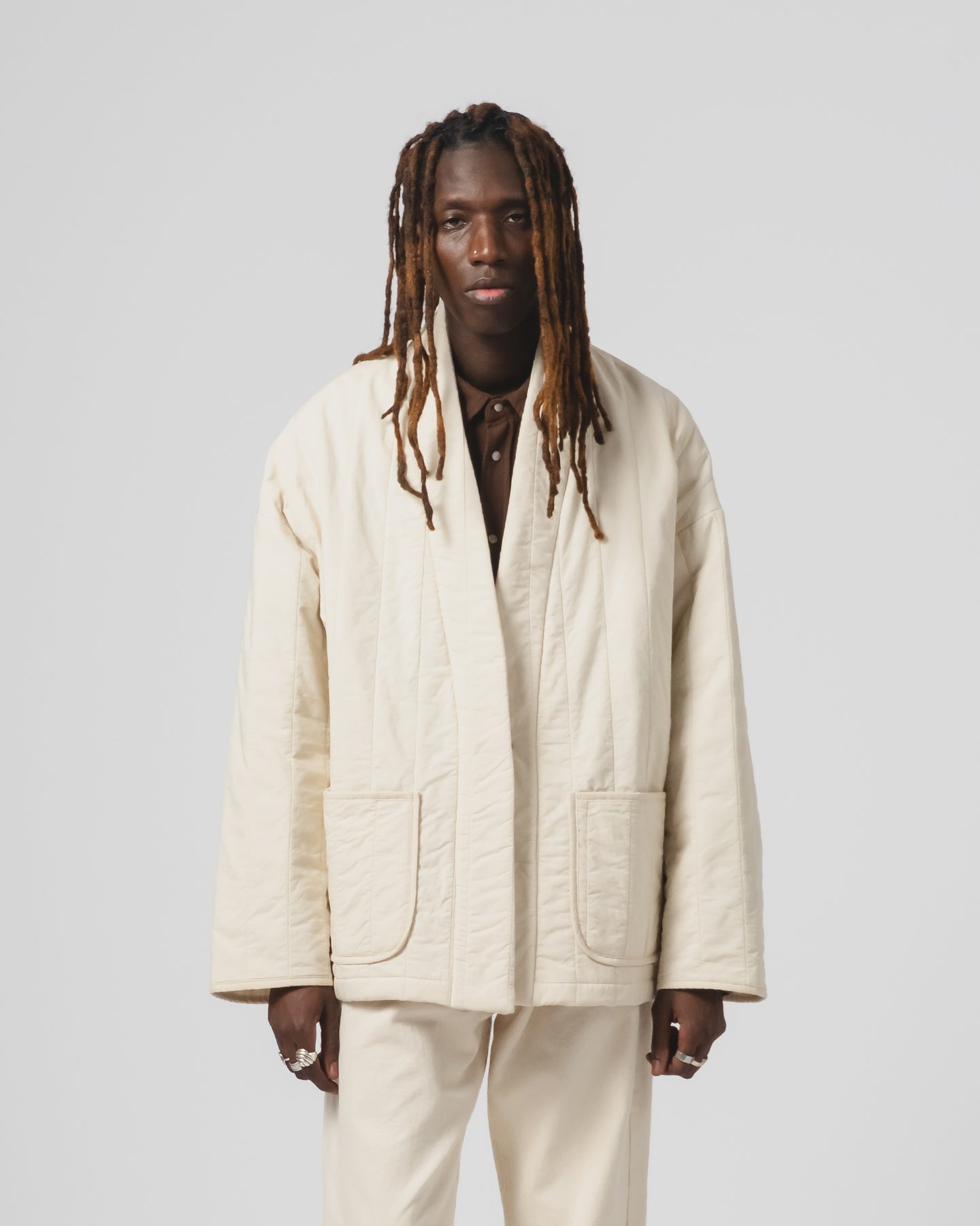 Take a Kimono, make it longer and make into a jacket. This is our Edo jacket. Made from a padded cotton for extra warmth, making it a great choice as an easy extra layer you can throw over your shoulders when needed.