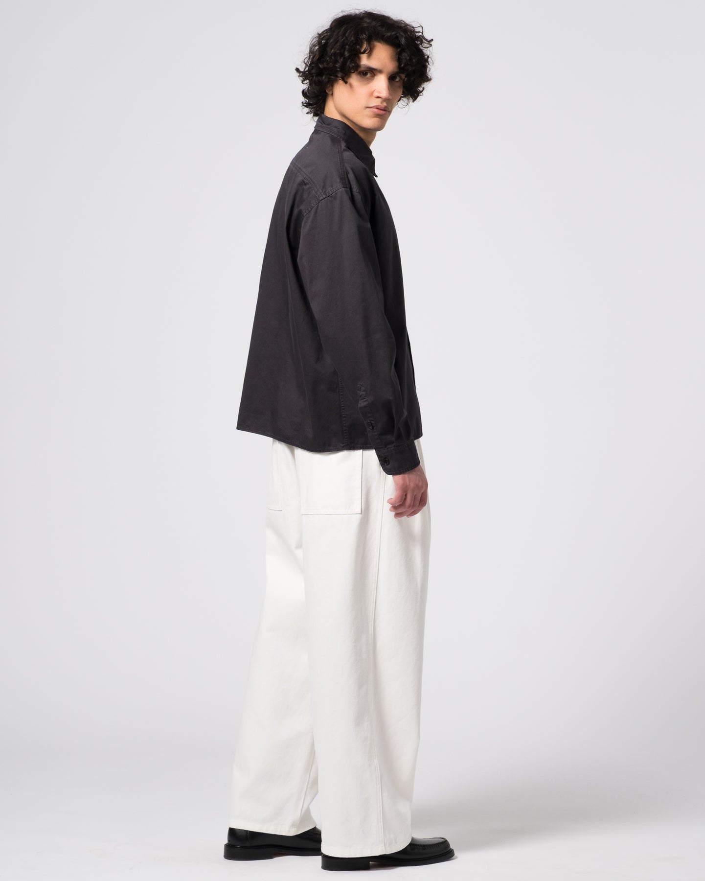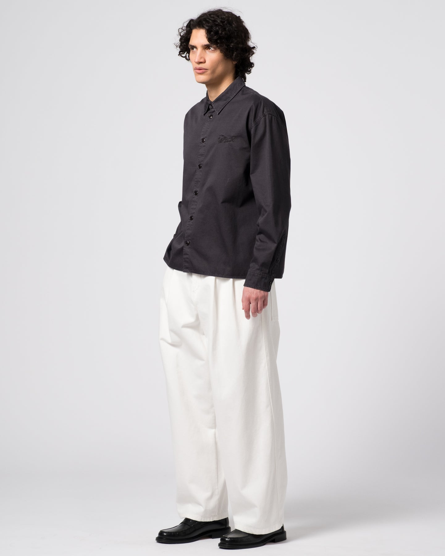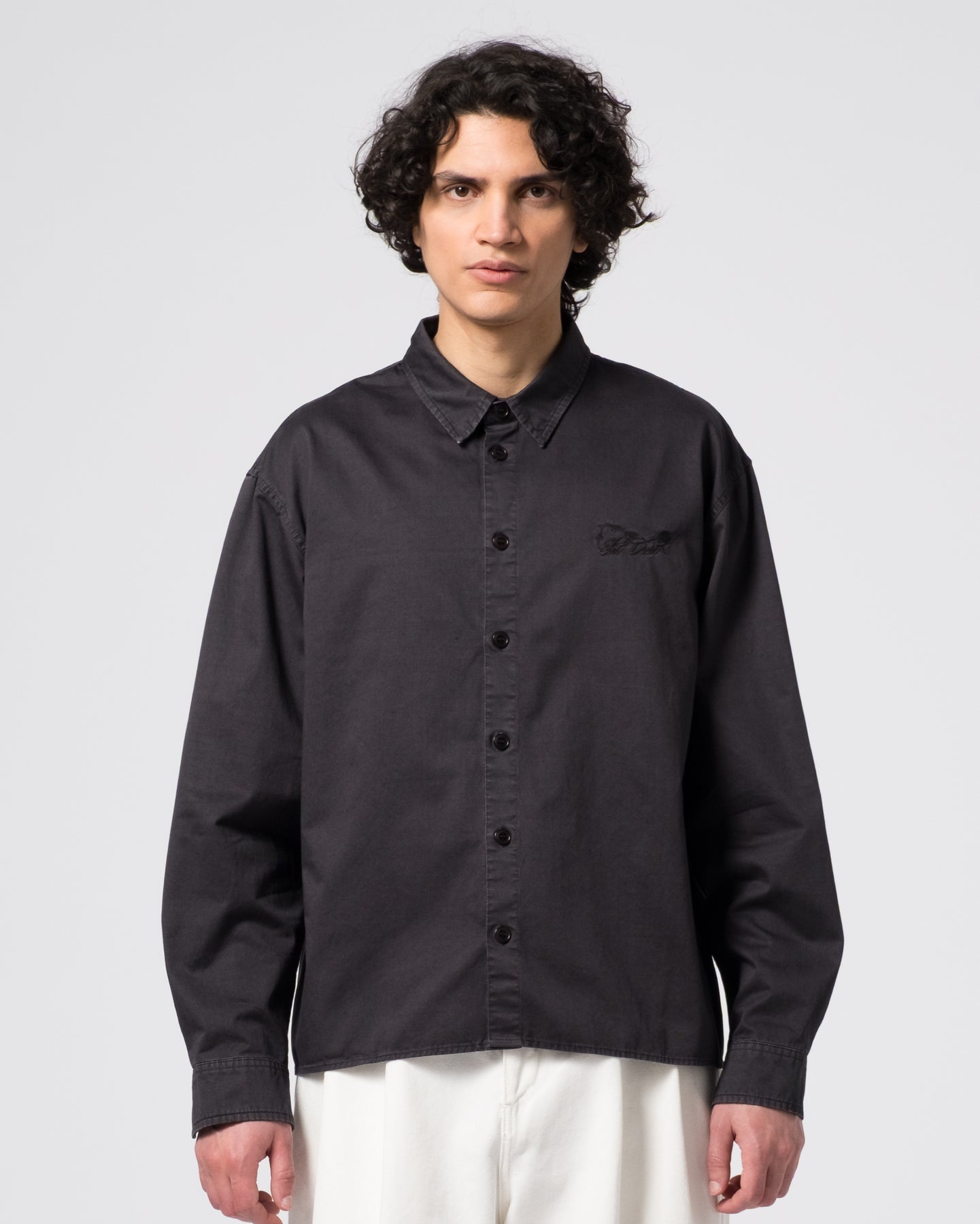 The Workshirt Fine Broken Twill Asphalt features an oversized fit similar to our Worker Shirt but without chest pockets, with a straight hem and a subtle chest embroidery. Crafted from a high-quality broken twill cotton in Portugal.