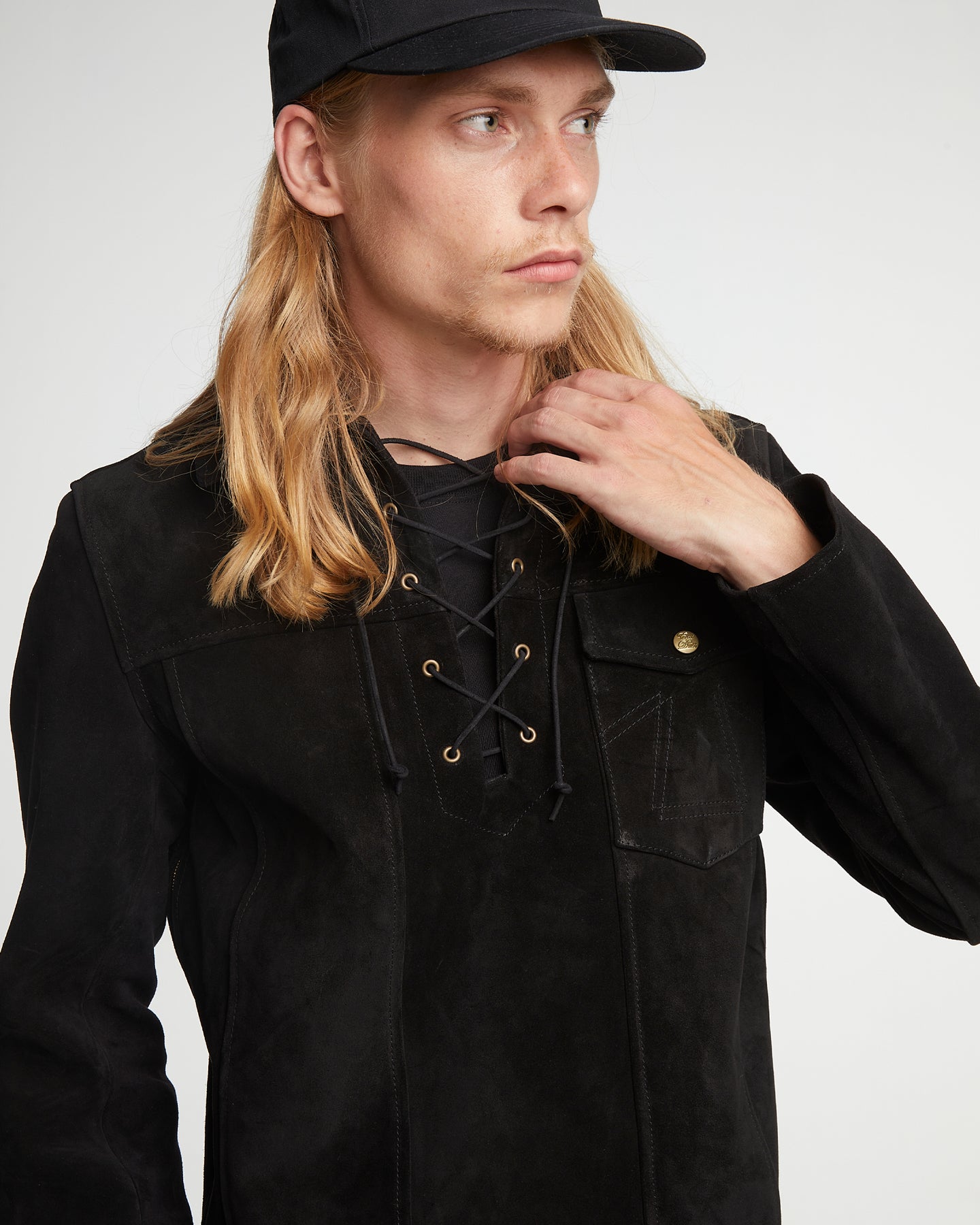 The Outlaw shirt is crafted from a smooth black suede Leather material. This Pull Over Shirt has a slim fit and is completed with two convenient side zippers for effortless wear and removal.
