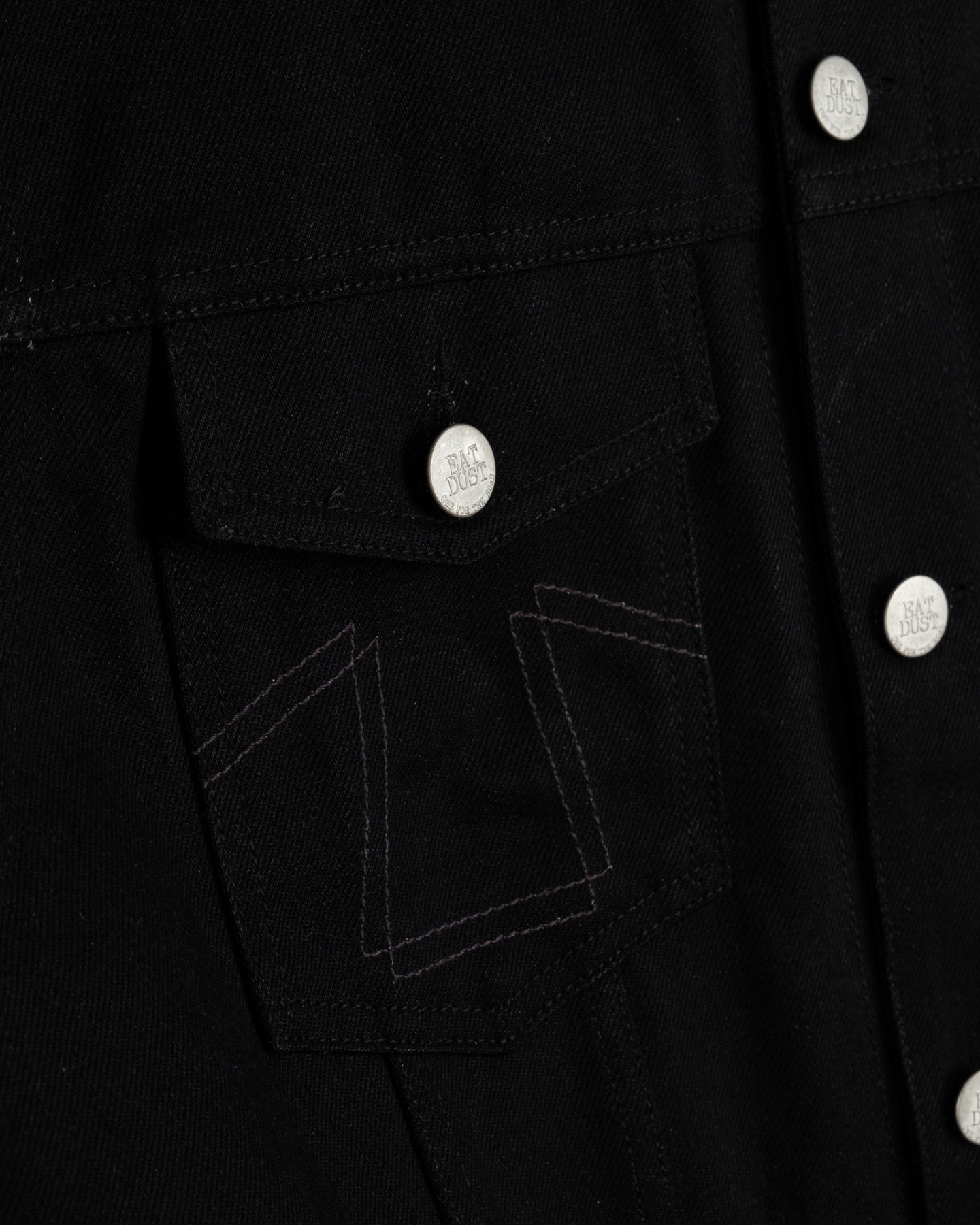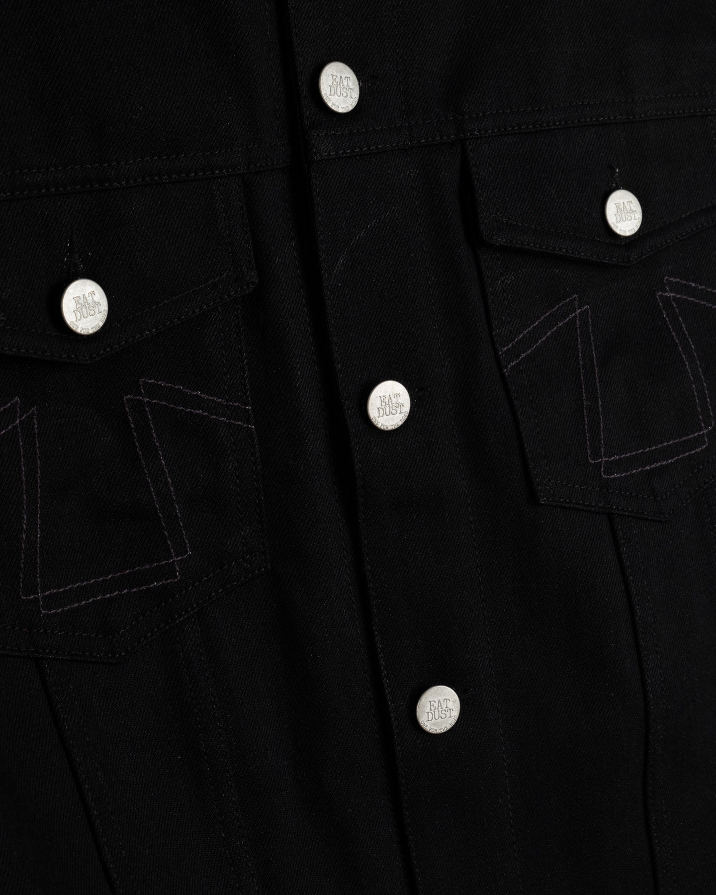 This black denim biker jacket was made from 14 Oz Japanese Black / Black Red selvedge denim. Features 2 patched on front pockets, with signature Z-bar stitching and faded copper Eat Dust buttons and a black leather Eat Dust label on the back.
