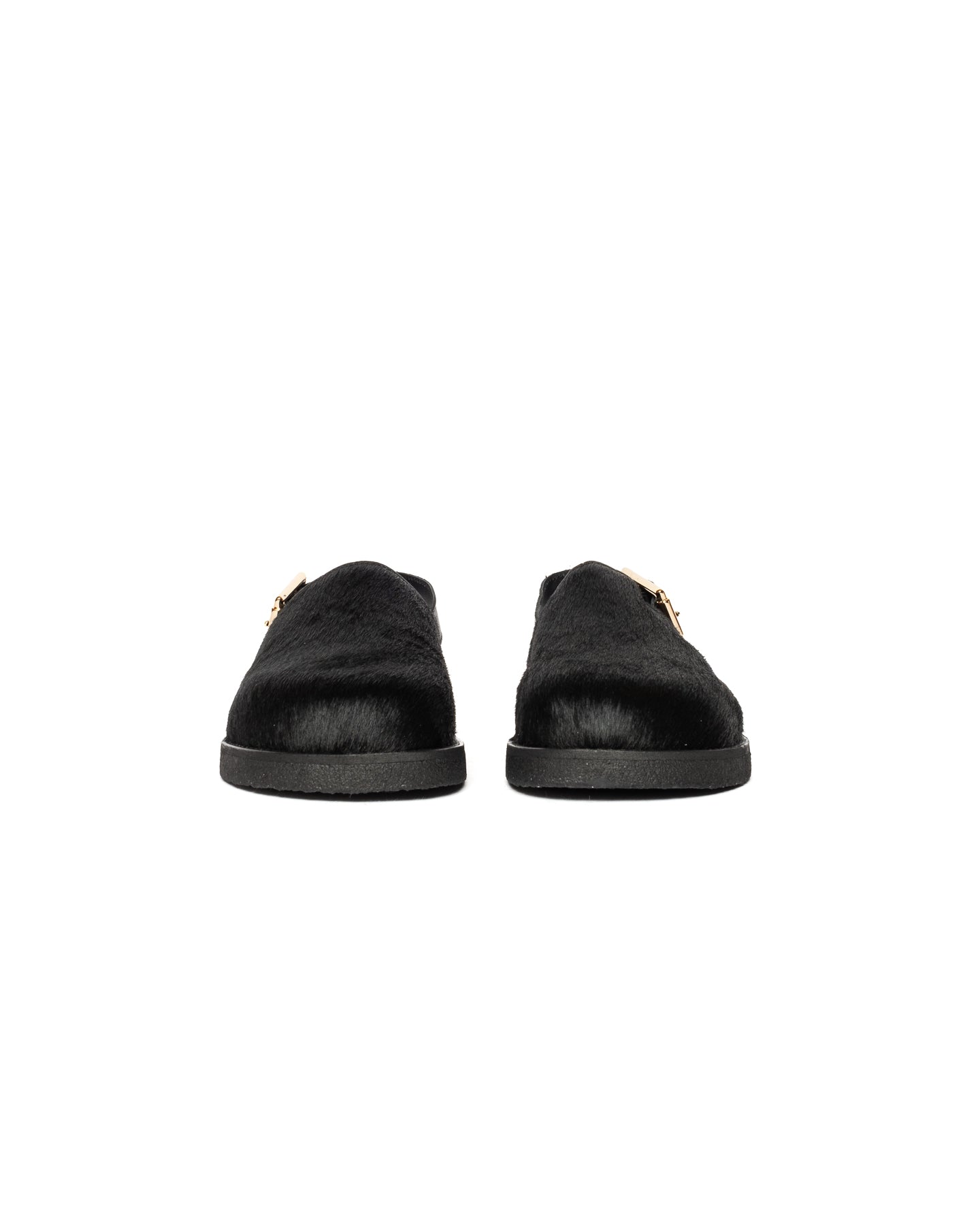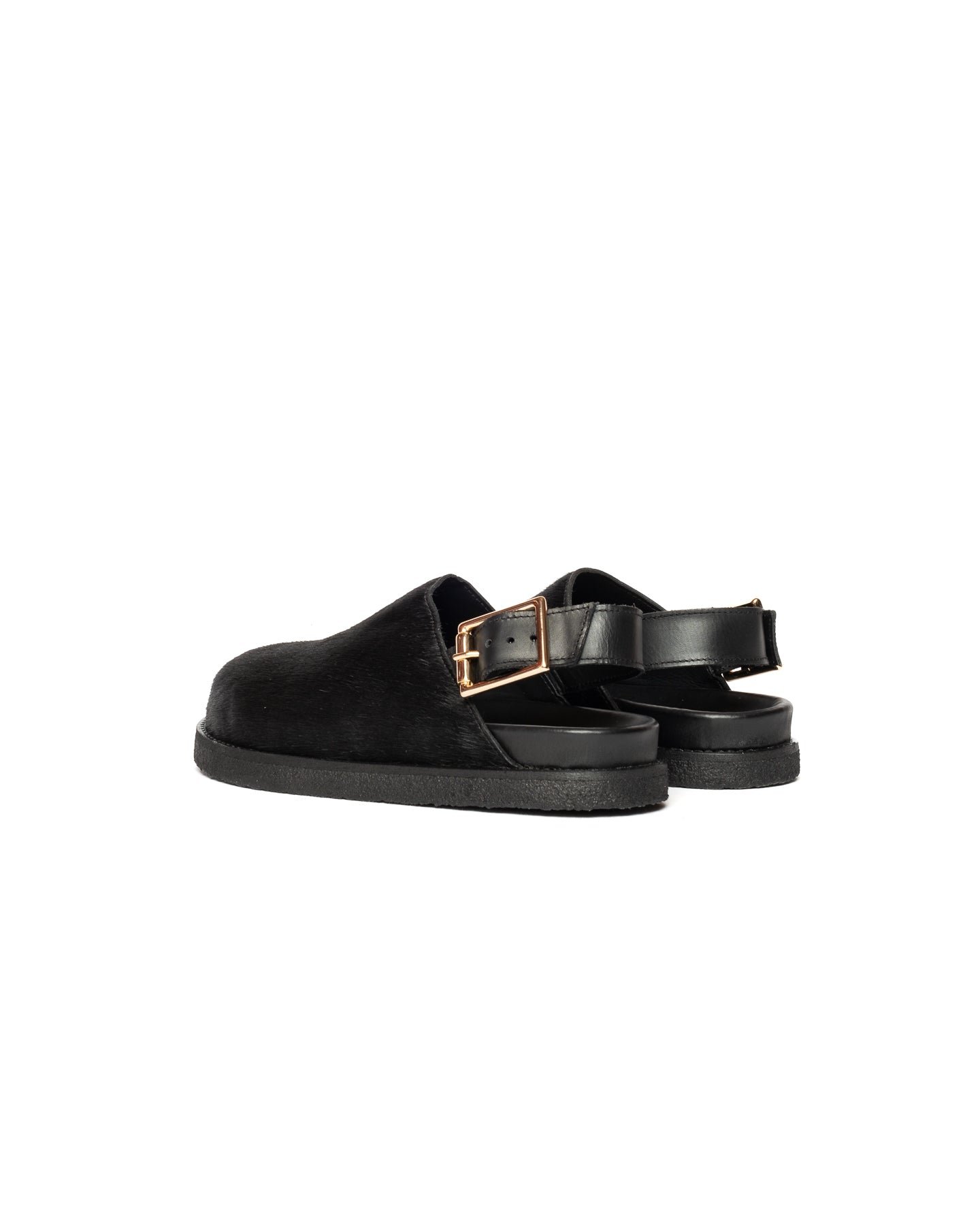The infamous VINNY's Strapped Mule features a pony hair upper in black. The crepe construction includes a supportive footbed lined in calfskin leather, along with an adjustable heel strap.