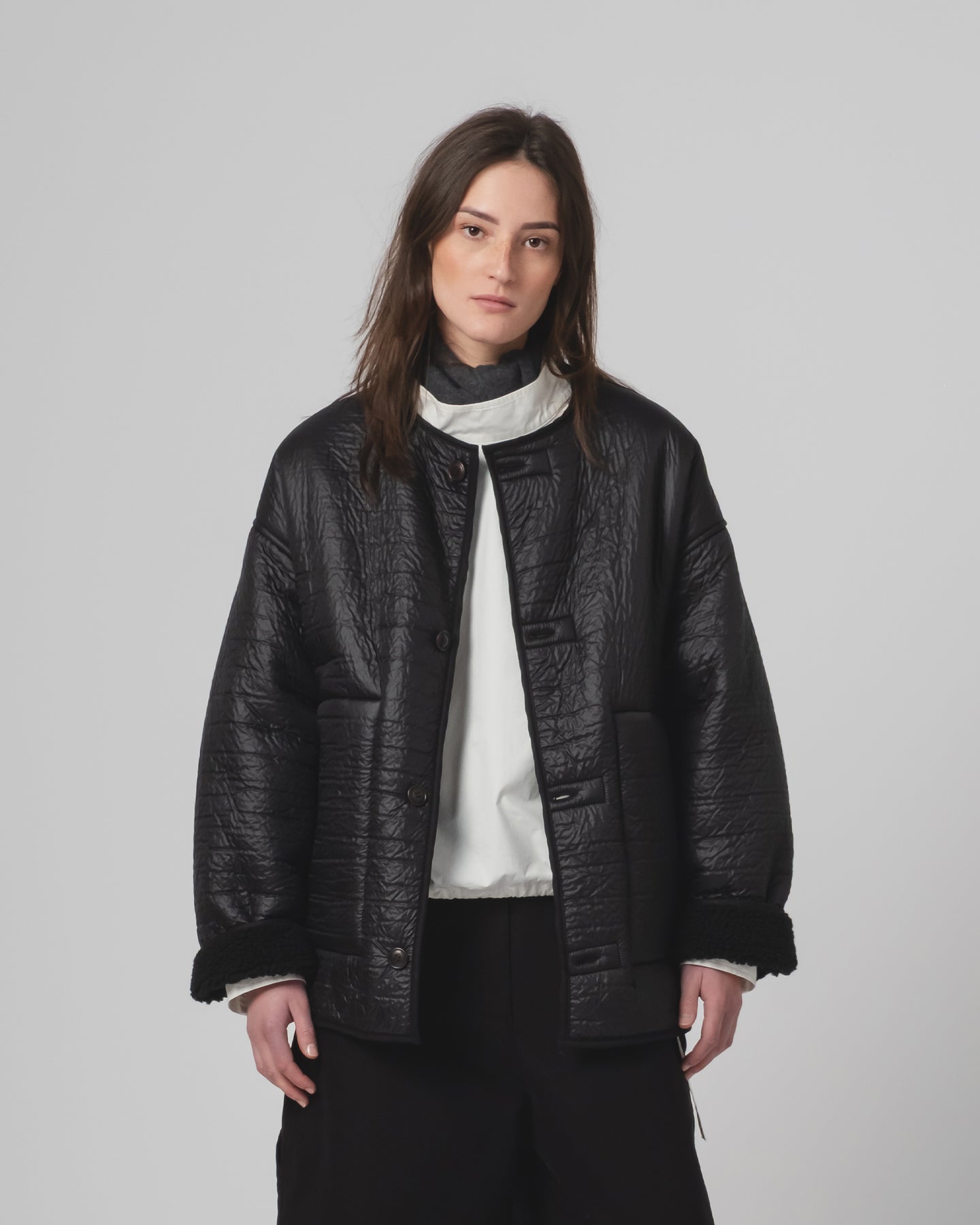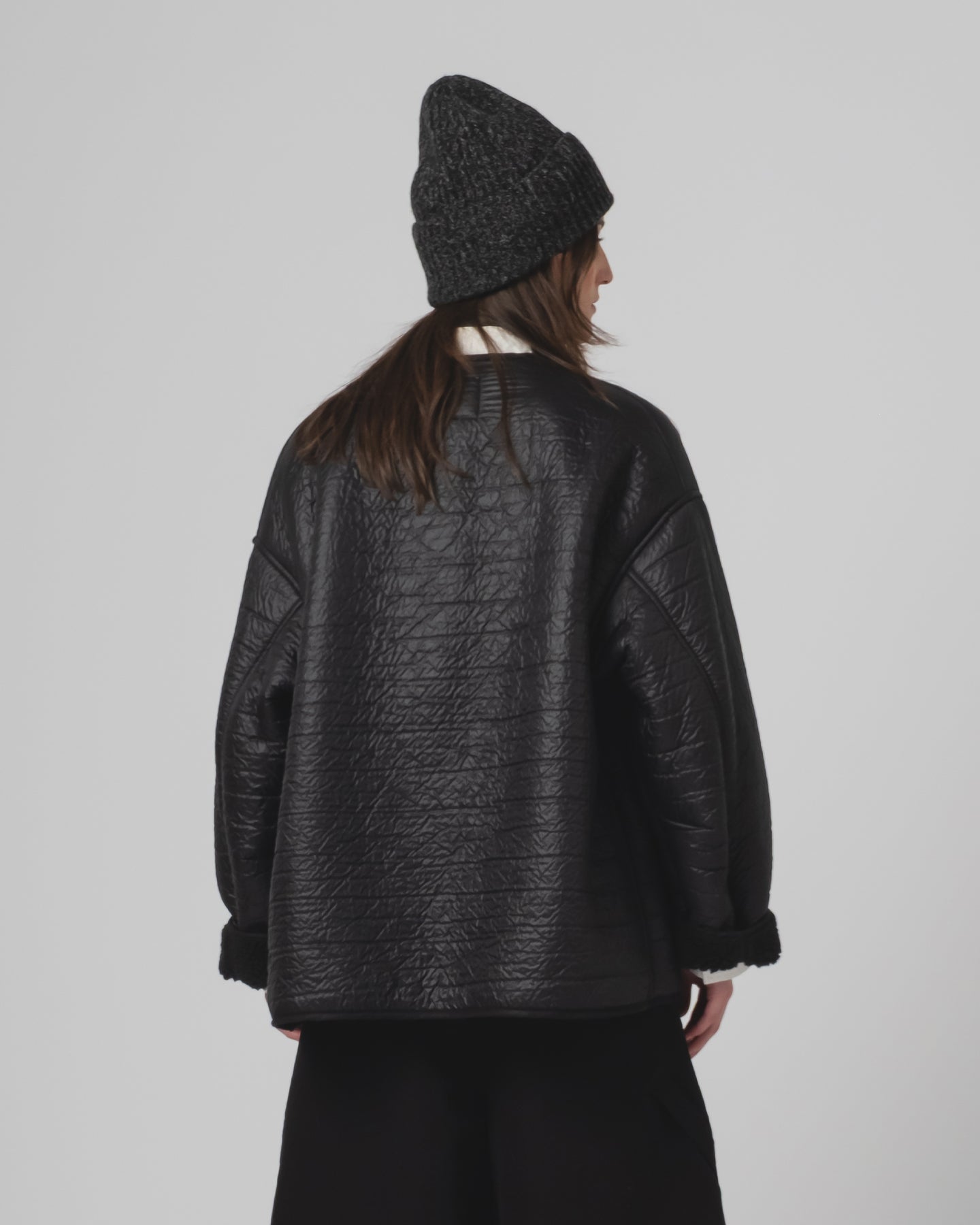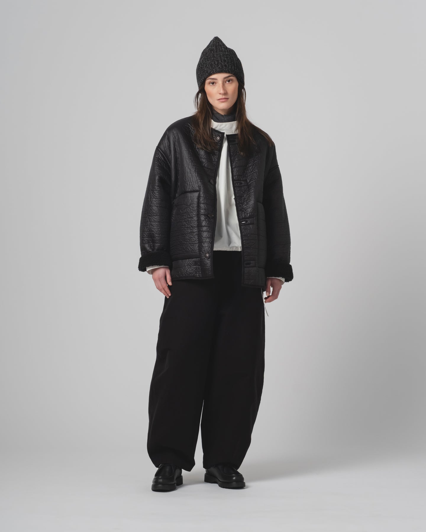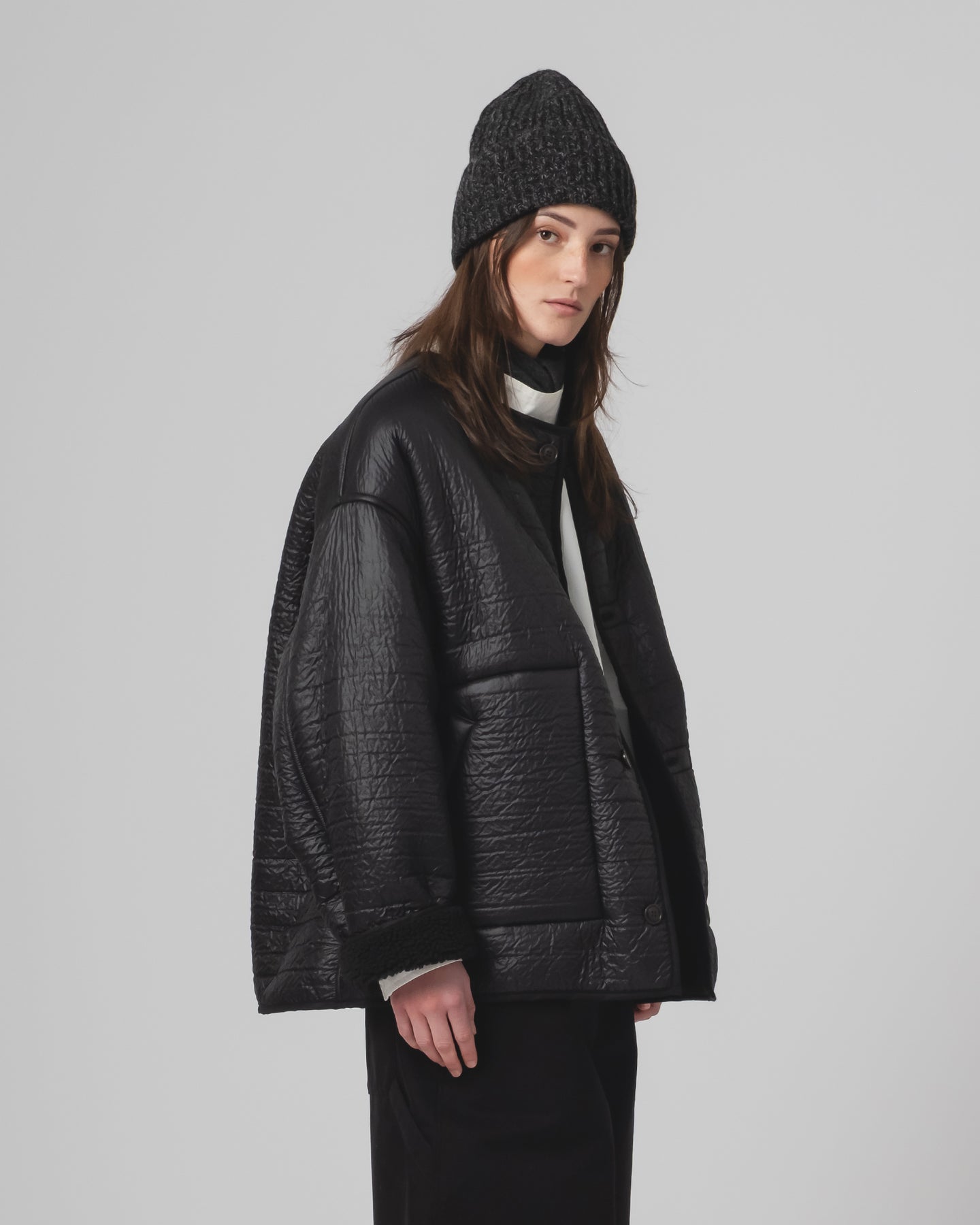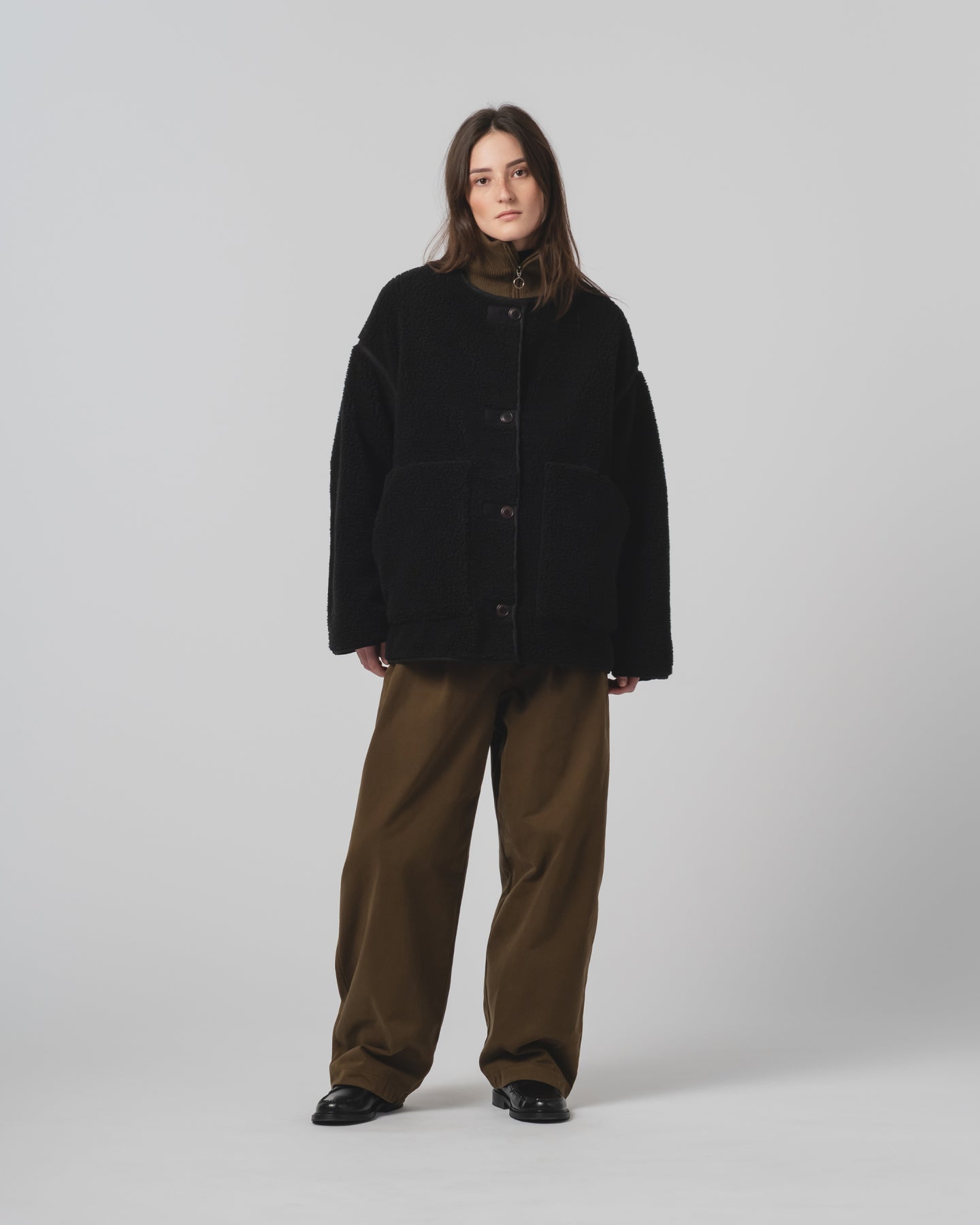 New for Winter 2025, the Solar Jacket brings a fresh silhouette to our outerwear collection. Featuring a long silhouette, collarless design, and full reversibility, it offers two looks in one with an easy, oversized shape and relaxed, dropped shoulders. The button fastening keeps things simple, while the streamlined design adds warmth without the bulk.