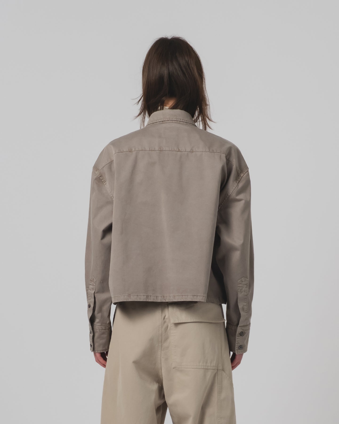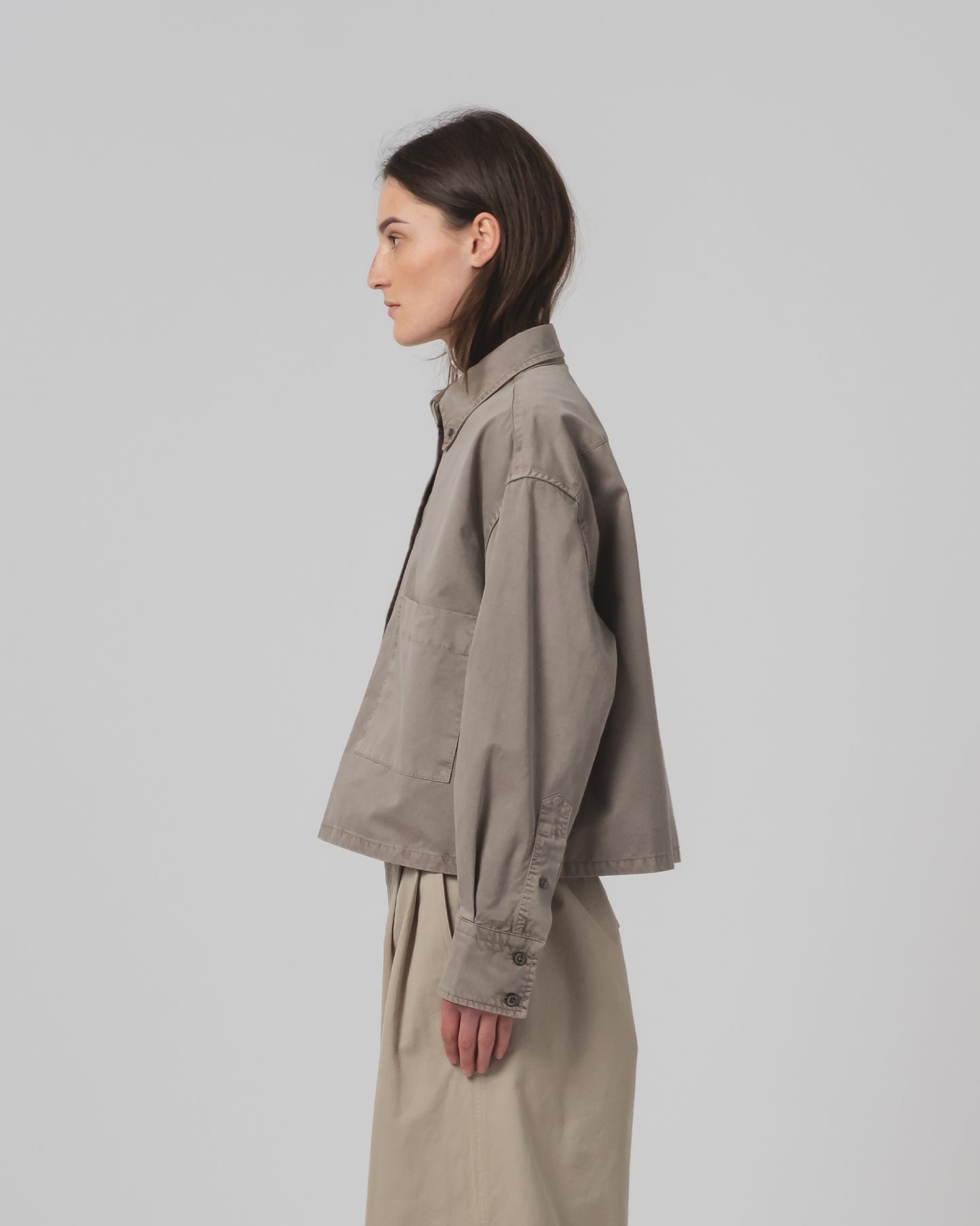 We took a true oversized Mens shirt, with a regular fit, asymmetrical pockets and cut it in half to give it a loose boxy fit and jacket like feel. Made from a fine broken twill cotton and finished with Corozo buttons.