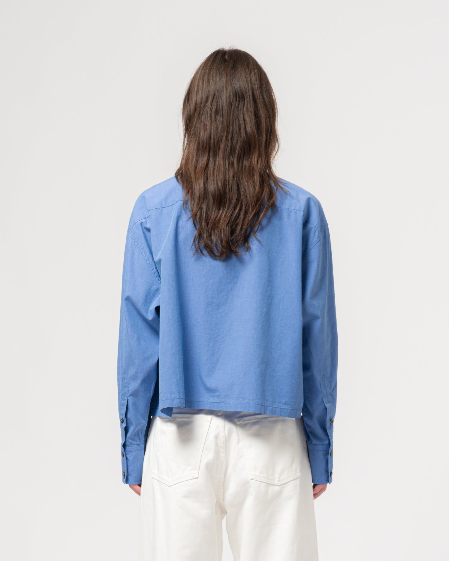 We took a true oversized Mens shirt, with a regular fit, asymmetrical pockets and cut it in half to give it a loose boxy fit and jacket like feel. Made in a light cotton for summer and finished with Corozo buttons.