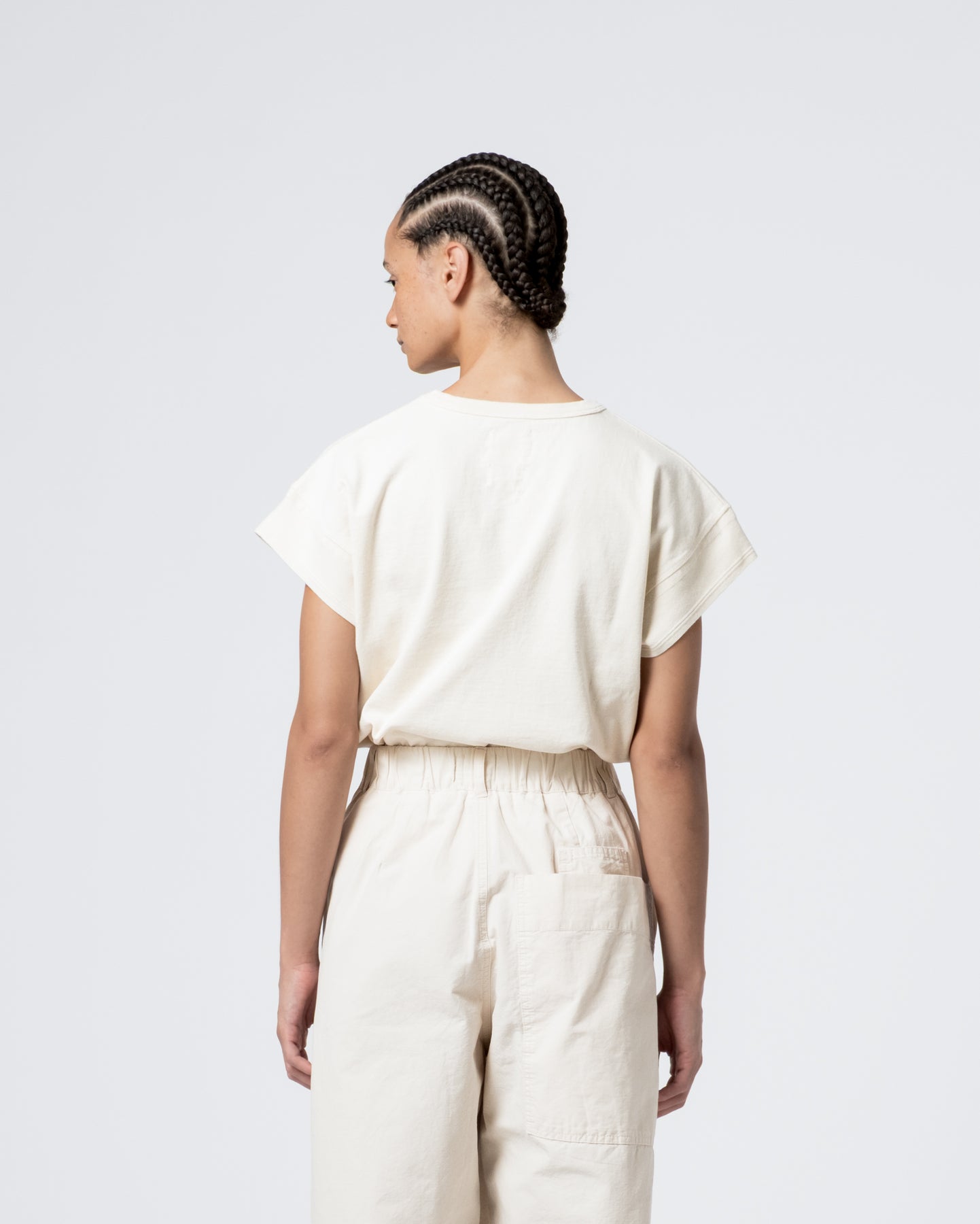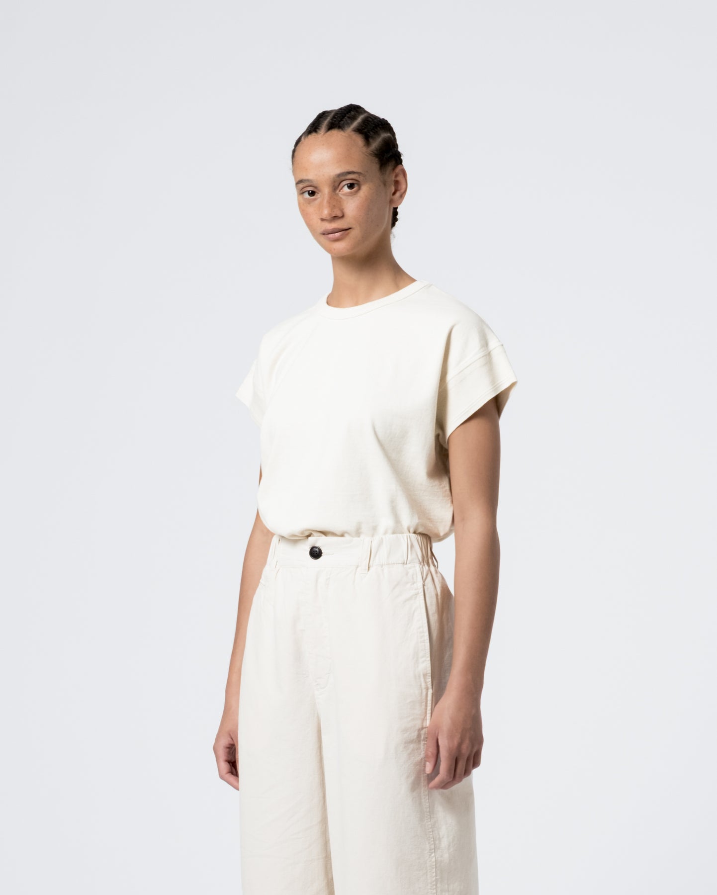 It's the return of our popular Muscle T. What's that? Well, it's a boxy t-shirt with shorter capped sleeves. An easy piece that fits well with shorts, denim, skirts or basically whatever you can think of. Cover your bases.