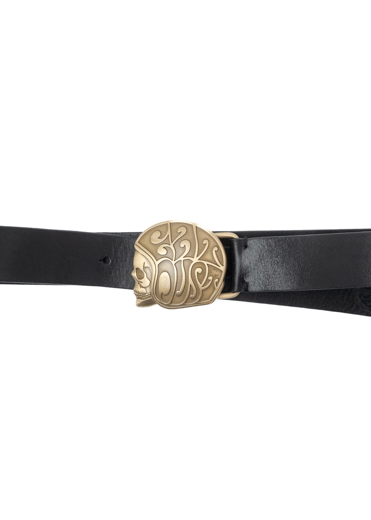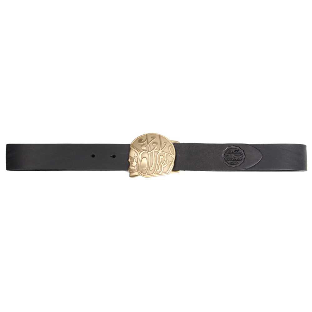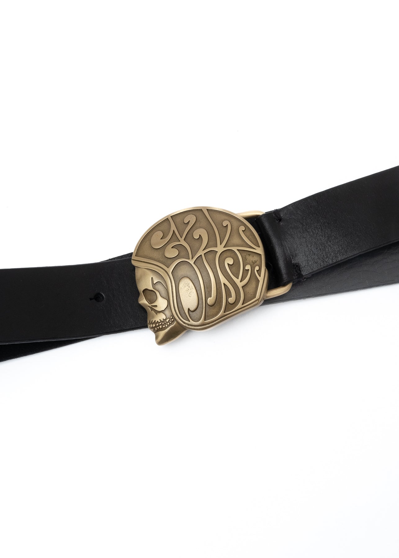 This classic black leather belt was made out of 100% full grain cow leather and features a brass Eat Dust Skull logo buckle.